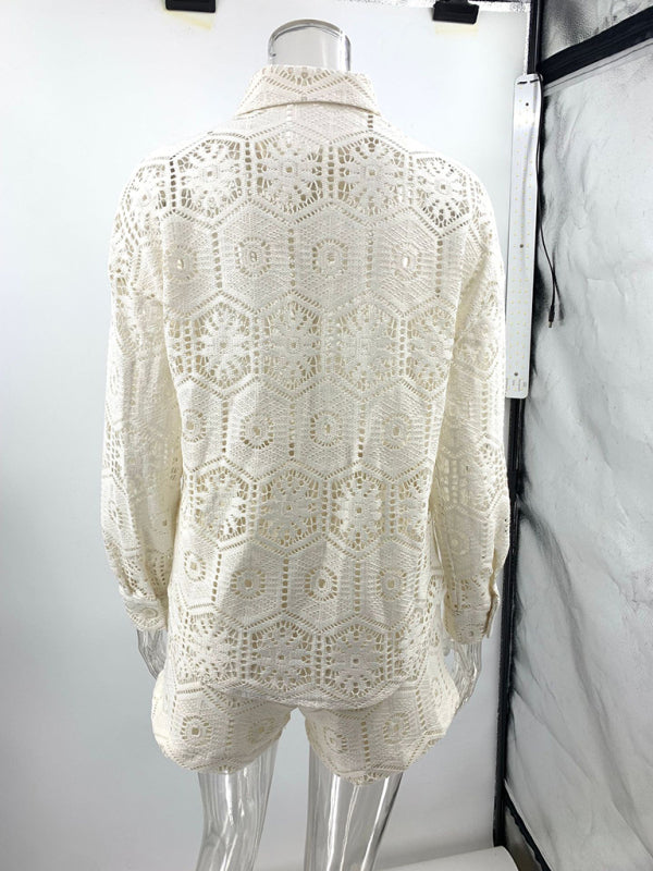 Casual style lapel single-breasted stand-up collar top lace shorts set