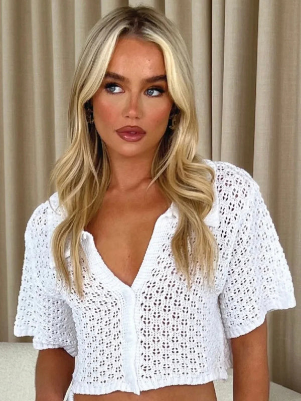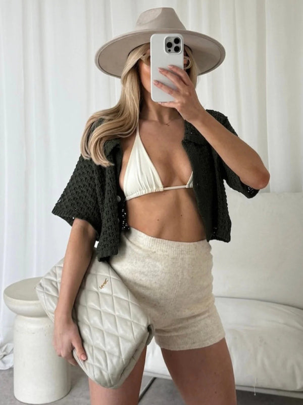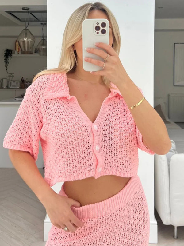 Knitted Crochet Dress Suit Multicolor Cardigan Button Skirt All-match Set