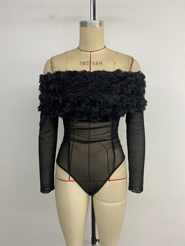 Party Hottie Sexy See-Through Mesh Off-Shoulder 3D Flower Solid Color Bodysuit