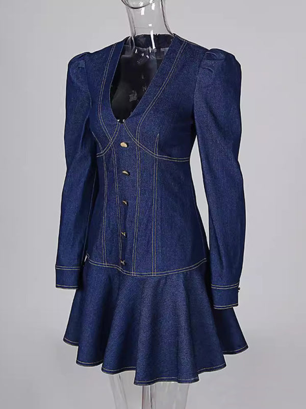V puff sleeve tight ruffle dress